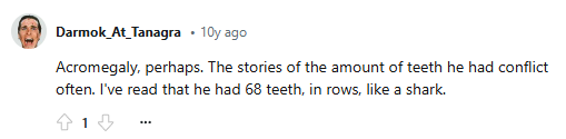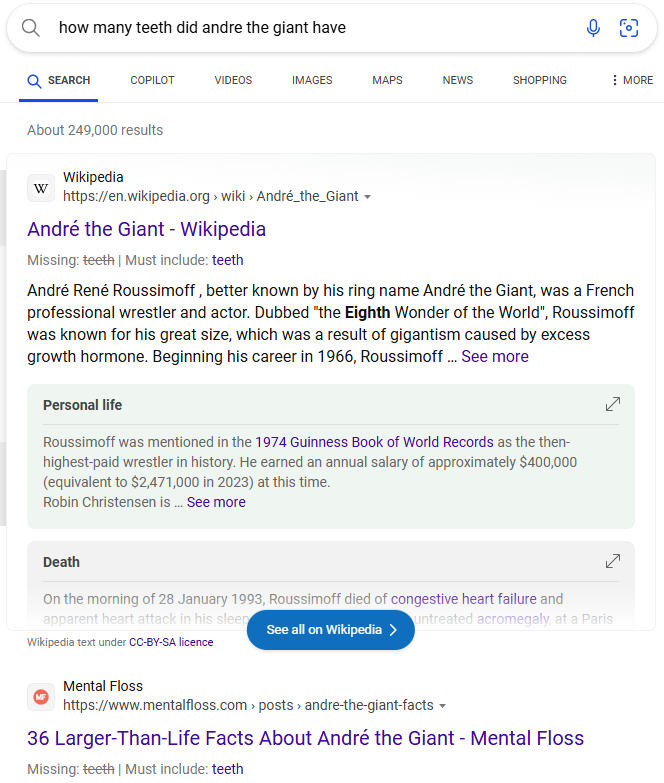 You would think Bing would have a handle on the key part of my search here. Like, here’s a random article but there’s no teeth in there. I just want to know how many teeth he had. You may ‘astound’ the odd passer by with stories of Andre the Giant, but I’ve heard them all. I’m a bloody journalist, I am.