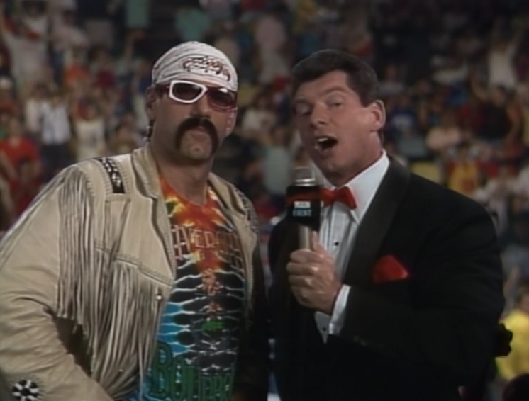 We’re in Topeka, Kansas. Not to be confused with Topanga, Boy Meets World. We’re at the Kansas Expocentre, which was built in 1987. So, it’s all shiny and new. Like a virgin. Ooo! It’s now called the Stormont Vail Events Center. A bunch of terribly named Kansas sports teams have played here including, get ready to giggle, the Kansas Koyotes, the Topeka Sizzlers, the Topeka Scarecrows and the Topeka Tarantulas. You may recognise it from its informal, and more frequently used name; the Landon Arena. Hosts are the sex trafficker Vince McMahon and Jesse “Abraxas” Ventura.