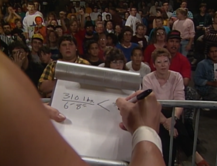 Mr Perfect arrives during the match, to kick-start his Hogan feud of the winter of 1989/90. This allows Genius to hit the moonsault, but Hogan kicks out and hulks up. Normally this would lead to big boot, legdrop, 3-count, posing but Genius, through his ART, upsets Hogan enough for him to pitch Genius clean over the top rope. Perfect whacks Hogan with the belt and Genius wins on count out! “Brains wins over brawn” – Ventura. Ah, that’s where you’re wrong. It was pure maths. Genius rips away the top sheet on his papyrus to reveal the figure 559,656. Holy shit, you son of a bitch, you did it. It’s like watching a magician.