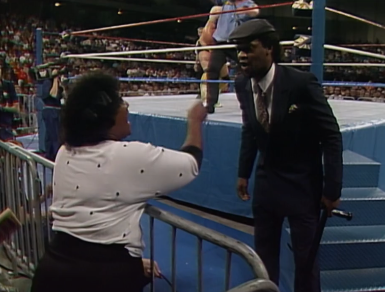 Video Control continues with Warrior, who does circles around Gene Okerlund making the kind of noise you would make if a vibrator was stuck up your arsehole. I guarantee you McMahon has the controls on that thing. Woyah promises to feed on the fruits of victory. What are the fruits of victory? Nectarines? I bet it’s nectarines. I hope Warrior manages to dislodge that vibrator before he wrestles Andre. I’ve heard stories.