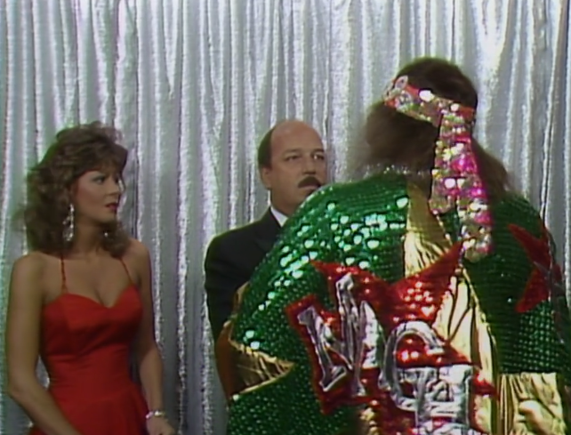 In a pre-match promo, Savage gets upset with Elizabeth for talking and Gene Okerlund for asking her a question. George Steele has a surprise for tonight. Is it a surprise for Liz?