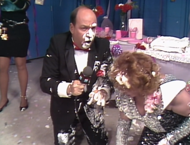 Obviously the cake goes flying. We have time to check in with Jesse Ventura who stops off to abuse Hulk Hogan before we check out.