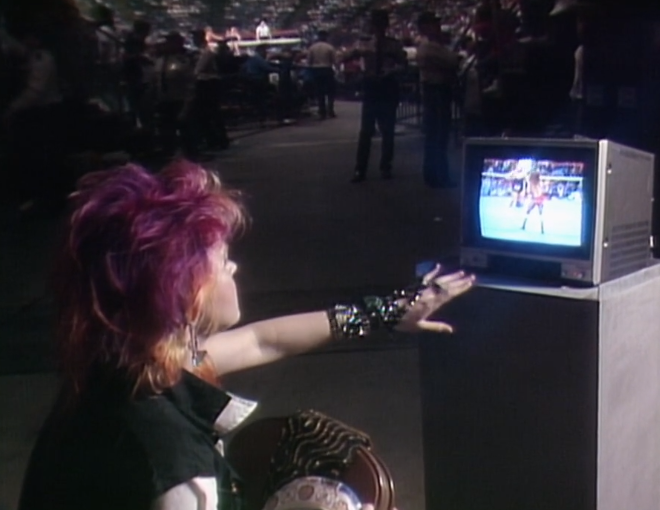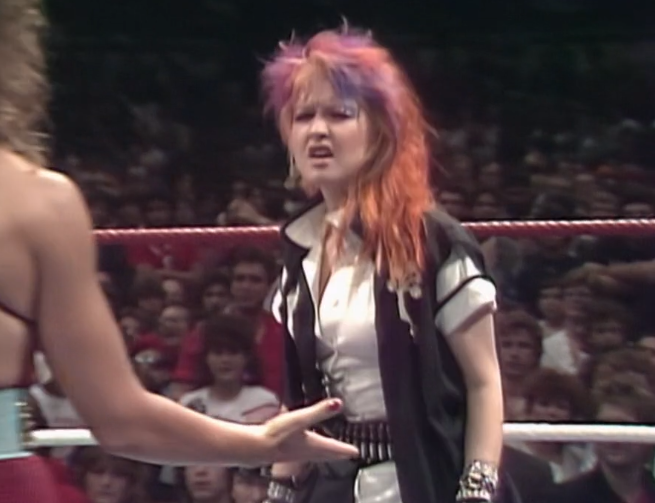 Moolah looks old as shit. She’s 61 years old here. Cyndi Lauper is banned from ringside after interfering in previous matches.