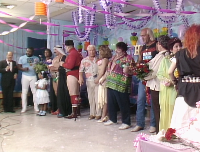 All the stars are here! Cyndi invited the Iron Sheik who badmouths Cyndi the whole time. Fred Blassie’s mother is about 28 years old. One of the perks of watching these shows back is realising how funny Fred Blassie was. Gene Okerlund goes along the row interviewing people.