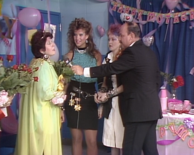 Cyndi’s mom looks very happy and has the same yappy New York accent. Fabulous Moolah gatecrashes the party to abuse the Lauper’s.