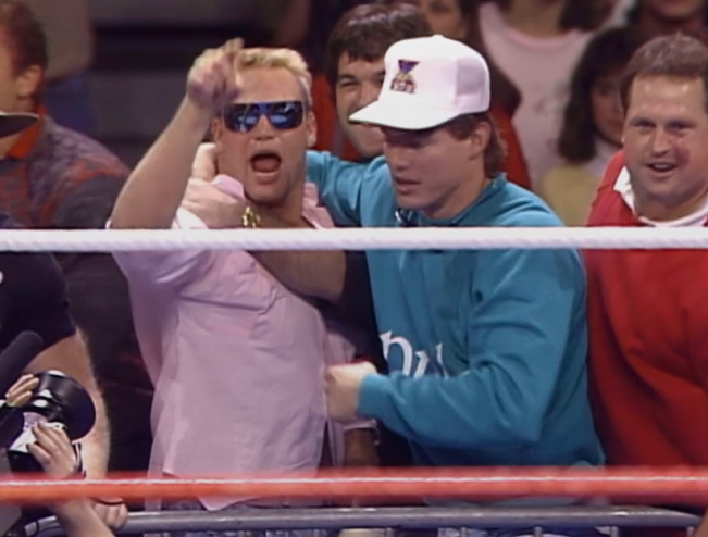 Before the match we see Brian Bosworth outside the ring. The linebacker was drafted by the Seattle Seahawks in 1987 and had a few successful years there before retiring very early in 1989 thanks to a shoulder injury. He then went into acting and starred in the 1991 actioner “Stone Cold”.