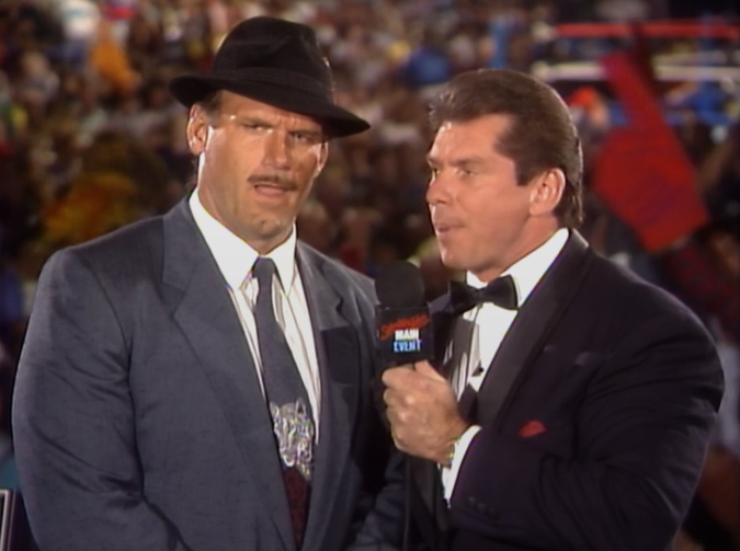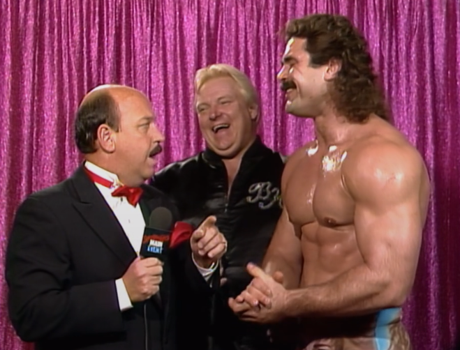 Rude makes a few dick jokes backstage, which pop Bobby Heenan. “I could beat Jake and Damien in the three-legged race” is elite stuff for sneaking it past the censors.