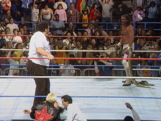 Video Control gives us clips of Boss Man beating up Hogan and Hulk responds via promo. It makes very little sense to not do this angle on this show. Just have Boss Man rough Hogan up a bit. Elsewhere Ventura goes to interview Andre the Giant, who says he’s not scared of snakes but please don’t even put him in a room with one again or even say the word, thanks.
