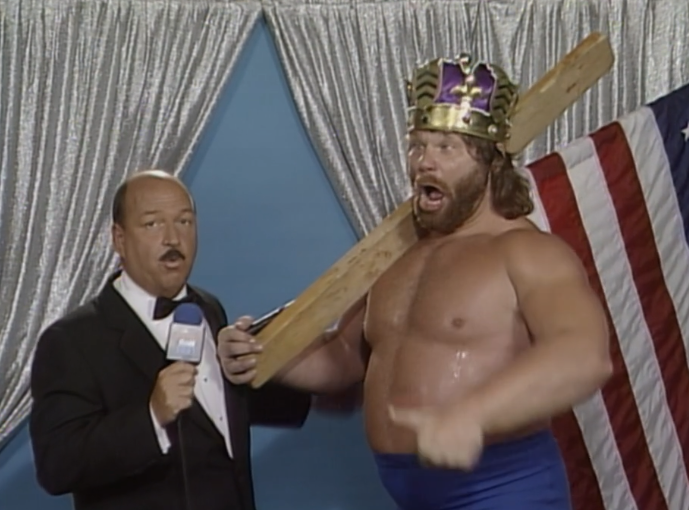 Duggan is rocking the “King Duggan” gimmick, which he achieved by beating King Haku. Thus treating the ‘King’ title as an actual, yanno, title. He’d eventually lose the ‘title’ to Randy Savage, the Macho King, and they eventually got around to the tournament. Before 1993’s PPV the whole ‘king’ gimmick was hard to keep track of.