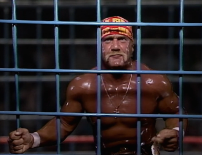 Hosts are sex trafficker Vince McMahon and Jesse Ventura. We open with the standard promos to hard cam business. Hogan is COVERED in oil here. We’re in Des Moines, Iowa. Ventura tells us he thinks Hogan is thinking too much about his movie and isn’t taking Boss Man seriously. They have a title match tonight inside the Blue Bar Cage.