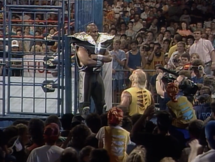 The WWF wouldn’t attempt anything like it again until Steve Austin feature The Condemned in 2002. They do a good job of teasing Boss Man taking the title here, which seemed very unlikely, even if you rate Ray highly. The highlight is Boss Man escaping and being suplexed back into the ring. In most eras, this match would be a blood bath. They do chain shots, and guys getting rammed into the blue bar cage. Even in TV friendly 1989 Boss Man ends up bloodied.