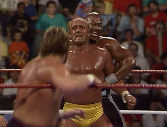 Snuka tries to be the guy he was in his prime and he can’t do any of that anymore. Not that he was that interesting to begin with. Snuka is very much a ‘rose tinted glasses’ guy in the history books because his splash looked good, and he was in cool, timely feuds. As a worker he was mostly boring. Here he’s boring AND he’s trying to channel Hogan and Flair. Savage hits Snuka with Sherri’s purse* for the win. Snuka’s selling was horrible here. He should have been put out to pasture. They did an ok job of hiding how shitty he really was and some of the camera angles made the match work.