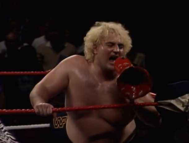 Both Adonis and Jimmy Hart bump around like crazy to try and get the match over. Adonis runs into Jimmy Hart’s megaphone and the crowd is so loud the sound distorts. JYD gets the pin. This was fine and it was over with the crowd, although the homophobia involved in having a gay heel getting beaten up sums up the action loving 80s.