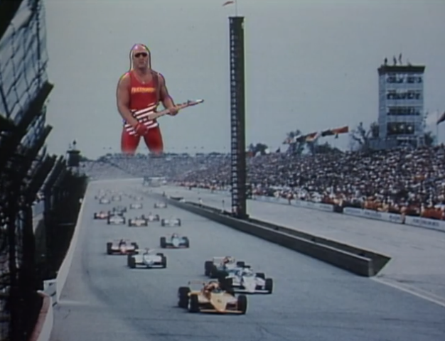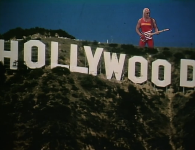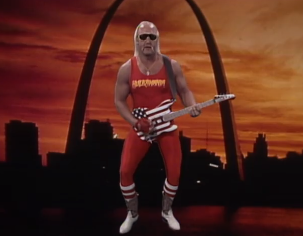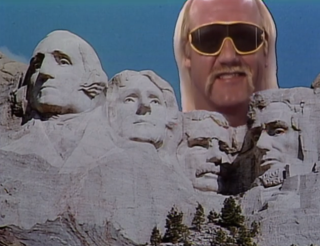 The video is mostly Hogan beating people up and historical figures (JFK cuts a promo at the start) but also, bizarrely, someone cycling into a wall. Just a complete throwaway high spot.