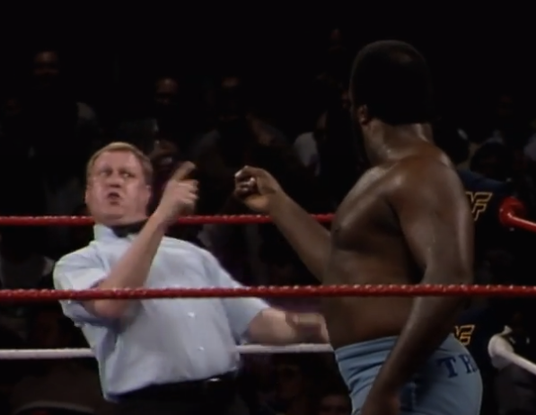 How many nicknames has Bob Orton got? I was laughing that they added “Boxing” to his nicknames and now it’s “Battling” too? Maybe they thought “boxing” was a little too on the nose. This is a worked boxing match. There has never been a worked boxing match that was good. Vince becomes an expert boxing commentator here and Ventura mocks him for it. The match is terrible until Orton knees T in the ribs, Piper gets involved and T punches Orton out of the ring for the win. This was awful and only served to set up the Piper-T Mania match. Piper and Orton kick T’s ass after the match with Piper using his belt. Ventura makes a reference to “Roots” and his Tito Santana stuff is a little close to racist but that’s probably over the line. Interesting to note that Hogan doesn’t bother coming out here for the save.