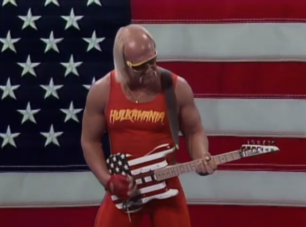 This is Hogan switching from “Eye of the Tiger” to his own music.