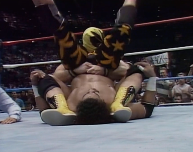 Young Stallions take another tremendous beating. How are they still in there? Roma catches Valentine with a sunset flip off the top, channelling Ronnie Garvin over in Chicago, and the New Dream Team are done. Another long segment with the Young Stallions follows, and it’s pretty clear the entire match is arranged to get them over. Tama dropkicks Brunzell while he’s carrying Bret but Jumpin’ Jim rolls through it for the pin. The Harts are out. That leaves it as the Bees & Stallions vs. Islanders. Not what you’d expect after seeing the opening teams.