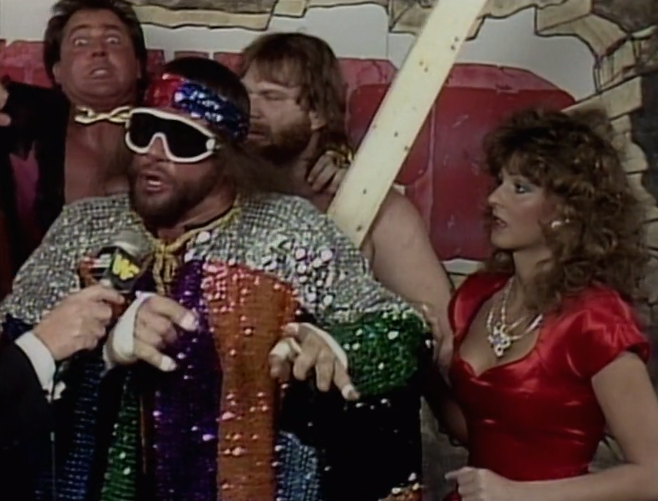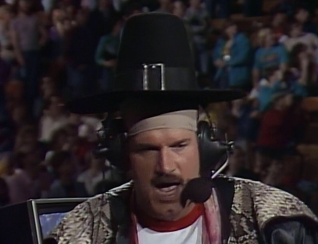 Not content with all that bullshit, we get an interview with the Honky Tonk Man to wind up the crowd some more. Honky challenges Hulk Hogan to come and challenge him title vs title. Big words for a guy whose team got embarrassed earlier.