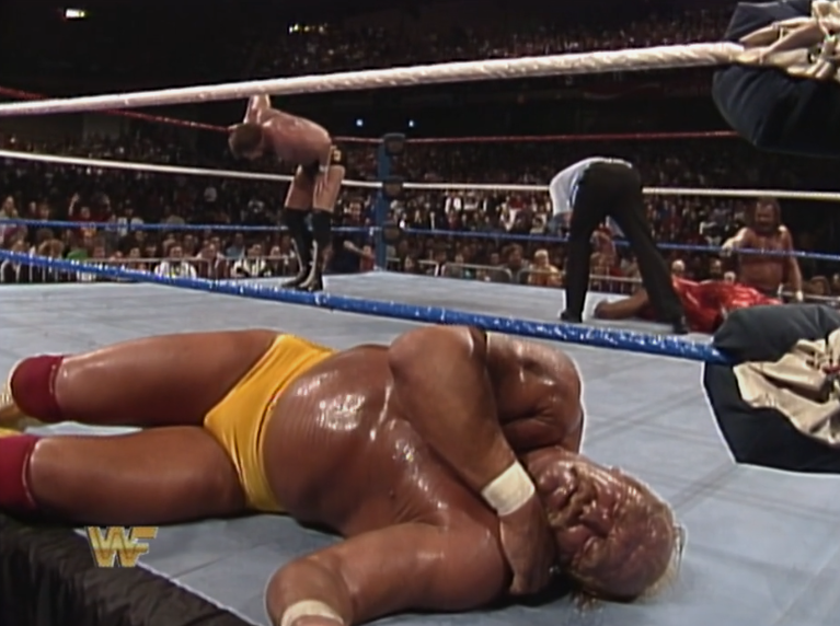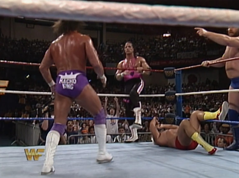 What the fuck is Jim Neidhart doing in here? Meanwhile, Bobby is replacing Tully Blanchard, who got fired for failing a cocaine test and is essentially done because of it. Considering how good Tully was, all the way up to this point, it’s mad he never caught on again. The next time I’ll be seeing him is on AWA Superclash IV*. Andre apparently hated Warrior so they keep their interaction quick here, with Andre knocked out of the ring and counted out inside 30 seconds.
