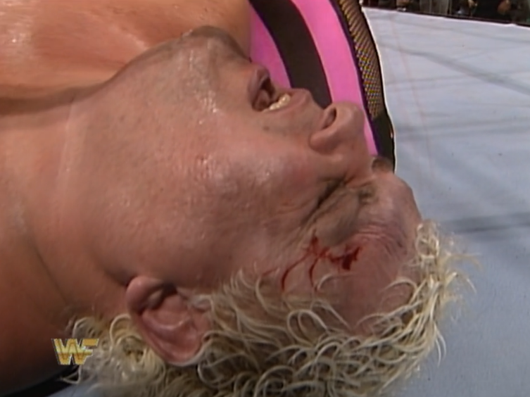 Warrior and Shawn proceed to combine shockingly well as a team. Warrior claims an assist for pushing Michaels into a crossbody on Haku and he’s gone. Arn gets mad at Heenan for short arming him on a tag. The rumour all night has been ‘trouble in the Heenan Family’ and that’s playing out here. Arn would head back to WCW after this show. What a fabulous year Arn Anderson had in the WWF. If you’ve never seen Arn in his prime, you’re missing out. He takes out Michaels with a spinebuster. The latest in a series of lame finishes. At least this spot looked cool.