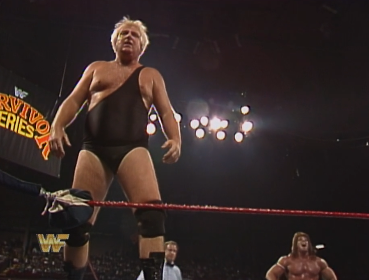 Given that it’s Survivor Series, they’re bound to find a cheap way to get around no one taking a job in the Hogan-Zeus situation. The solution? Zeus gets disqualified after a few minutes. Earl Hebner tries to drag Zeus off Hogan and Zeus shoves the ref over. DiBiase explaining cash flow to Zeus on his way out. “You want to strangle him to death, do it on the No Holds Barred The Match/The Movie PPV brother, that’s where the big bucks are. You get more points off the vig”.