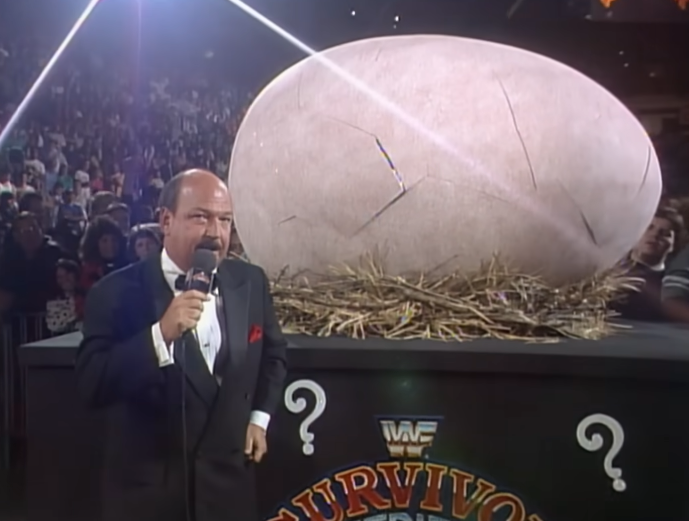 We run through the card and WHO COULD THIS MYSTERY MAN BE? One of those surprise entrants that changed the WWF landscape for the next 20+ years. An iconic character. I hate him but hey, this is the WWF. If I liked it something has probably gone wrong. Speaking of which, Survivor Series is easily my least favourite Big Four PPV. I just don’t like the concept that much and they’ve still not learned to mix it up. This is the last time they go wall-to-wall on Survivor matches. Roddy yells about Saddam Hussein and I’m reminded of the gigantic egg. Yes, it’s *that* show.