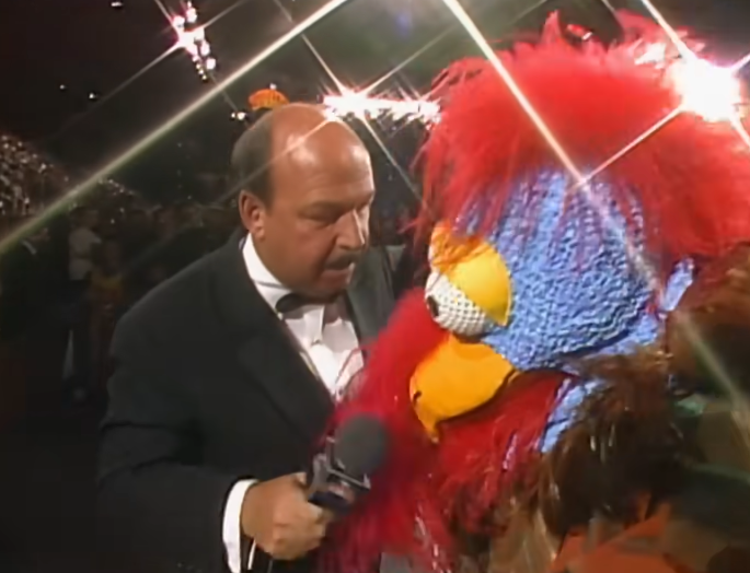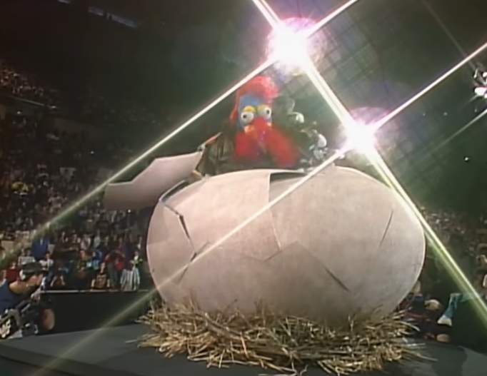 Video Control throws us to Gene Okerlund who’s standing by the gigantic egg, which is about to hatch. They shilled this a lot in the buildup to Survivor Series and people thought it was going to be Ric Flair or something (no, really. People thought they’d debut Flair by having him pop out of a big egg). Instead, it’s the Gobbeldy Gooker. The idea behind the Gooker (Hector Guerrero here) is that he’d be a WWF mascot. Going to live shows and hyping the crowd up, etc. Vince wanted a worker under the costume so he could have matches. This never happened.