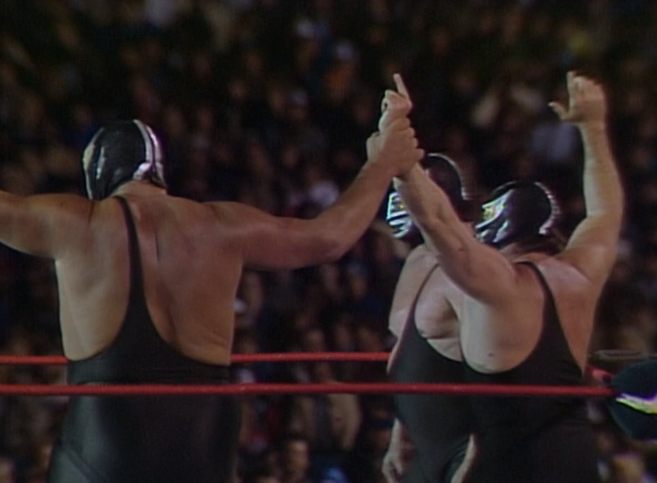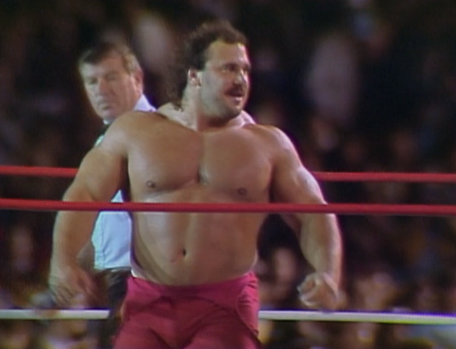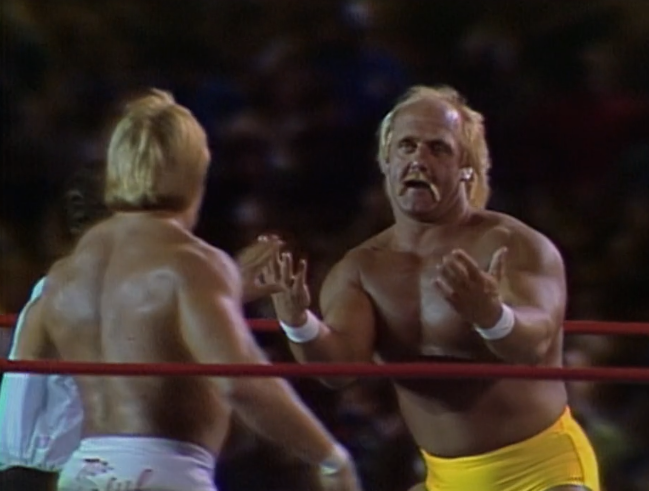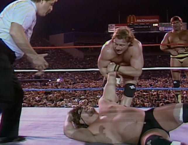 We get a promo with Bobby Heenan, where he promises Paul Orndorff will win the title tonight. He also wants to remove the masks of the Machines. All three of them! Will we finally discover the identity of the mysterious Giant Machine? So, Andre missed a match against the Heenan Family and was “suspended” to write him off TV while he shot his part of the movie, the Princess Bride (which is wonderful, stop what you’re doing and watch it). When Andre came back, they stuck him under a mask and teamed him with Bill Eadie. The idea being they’d have a laugh at Heenan being unable to unmask Andre. Yucks galore. Then they just dropped the angle as Bobby Heenan said he wasn’t interested in Andre being fired anymore. Why? Because he knew Andre was turning on Hogan. This stupid angle is all to set up an actual good angle down the line. Long term planning!
