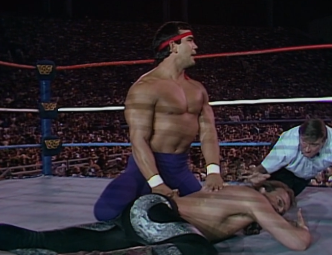 Pedro came back in 1985 after some time away. He used to be the WWF champion and a big star, but those days are long gone. He lost the WWWF title back in 1973. Harley isn’t exactly a spring chicken (he’s 43) and both guys are at the tail end of their careers. They get saddled with the same terrible referee as the last match. He telegraphs the finish with his shitty positioning and Harley pins Morales with his feet on the ropes. This sucked but at least it was short.