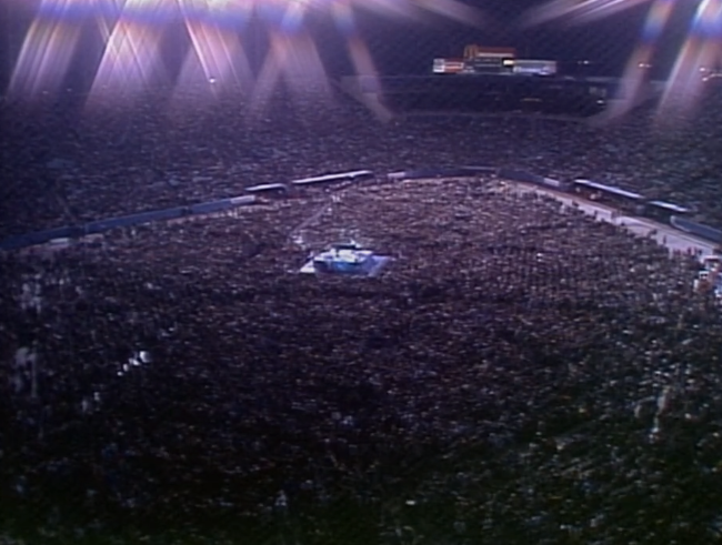 Gene Okerlund greets us from a helicopter, interspersed with clips from the forthcoming event and the crowd going wild for shit. The stadium is the CNE (Exhibition Stadium), former home of the Blue Jays. The Blue Jays left in 1989 and the stadium closed in 1996.