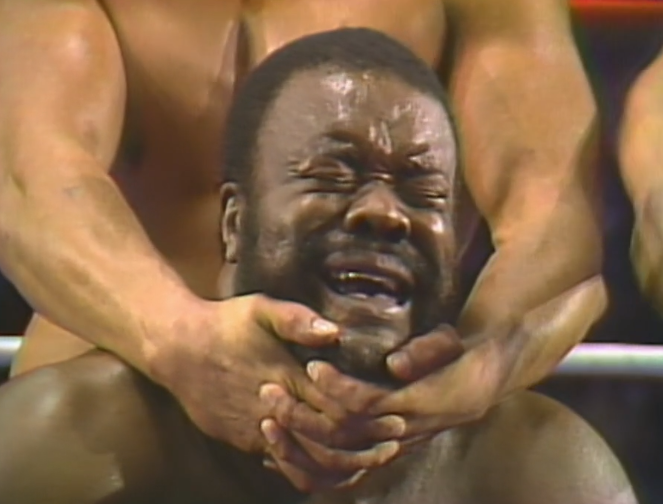 Adonis politely slaps on a chinlock so Jesse doesn’t miss too much action. Dynamite Kid is one of those guys who was way ahead of his time, to the point where he has no chance of getting pushed. He’s WWF small, for the era, but is jacked to the gills, incredibly mobile and technically excellent. He has modern era athleticism and most of the guys from this era just couldn’t keep up with him. This is going fine until Adonis runs into Jimmy Hart accidentally and Dynamite Kid gets the roll up to advance. **½