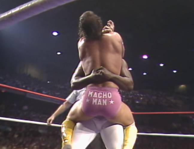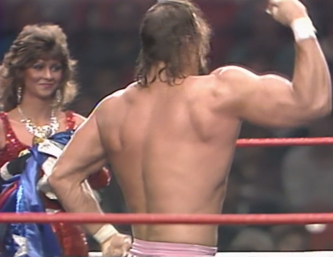 Before you get all excited, they only give them three minutes here. Savage hides behind Liz and then Pearl Harbors Steamboat, who’s from Hawaii, so that’s real personal. Well, he’s billed as being from Hawaii, he was born in New York. They don’t quite have the chemistry down here but it’s close and you can sense the match they want to do. Blistering quick, loads of countering and (for the time) high spots. Savage pulls out the foreign object, Steamboat tries to back suplex him and Savage bashes him between the eyes for the pin. This was frenetic. Both guys were primed for something bigger than this but for three minutes this was great. ***