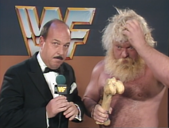 Video Control takes us backstage where Okerlund tries to interview Moondog Spot who can only grunt and rub his head.