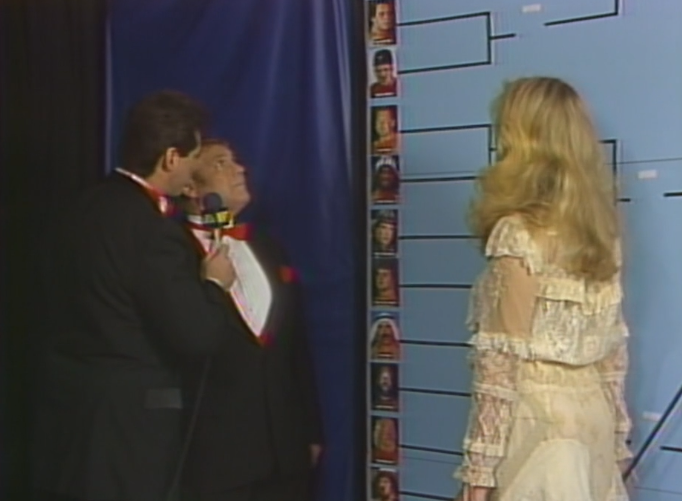 Vince McMahon introduces us to the show and he’s got Lord Alfred Hayes on hand to run down the tournament bracket. Look at how ropey this shot is? It almost beggars belief they let this air. The woman’s name is Susan Waitkus and is here to point at stuff. In running down the draw the one babyface pairing is dubbed a “scientific match up” and a two-heel clash is dubbed as “interesting”. In comes Jack Tunney to be boring. Gene Okerlund cuts him off. Tunney was an onscreen authority figure, which in retrospect was completely unnecessary. Okerlund is way underrated as an interviewer. He knew when to stop people jabbering and bailed out more than a few superstars.