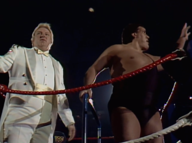 Bobby Heenan, who’s changed his clothes from black to a snappy white ensemble, says Hulkamania is dead and he’s looking forward to managing to the world champion. Andre stares off into the distance.