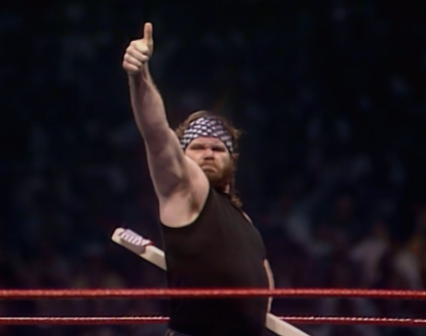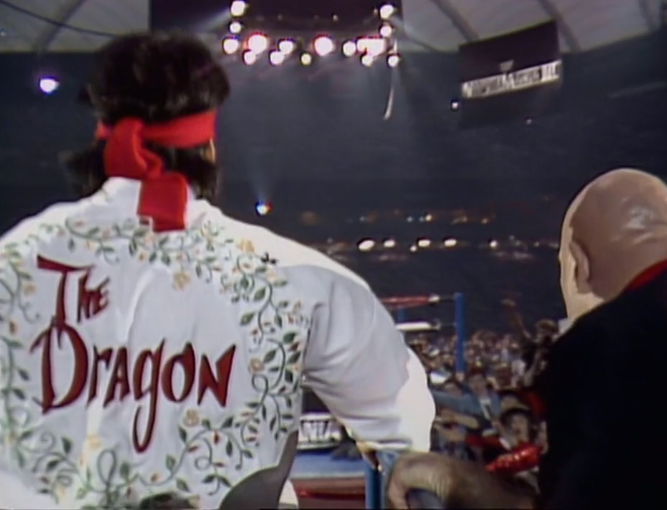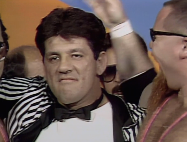 Bobby Heenan, who’s “on a roll today”, points out he’s two for two tonight, counting Hercules as a win after he busted Billy Jerk open. Monsoon points out Bundy lost. “I wasn’t out there for that match!” The Rougeau’s should win here thanks to a cool looking flying knee from Jacques but Dino Bravo jumps in there behind the ref’s back for the sneaky win.