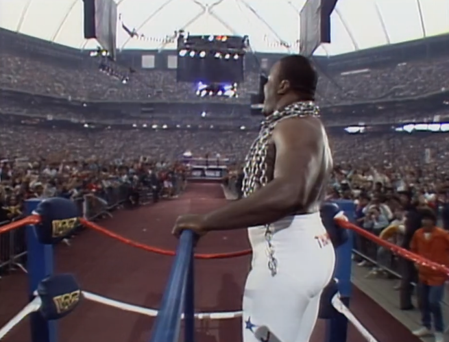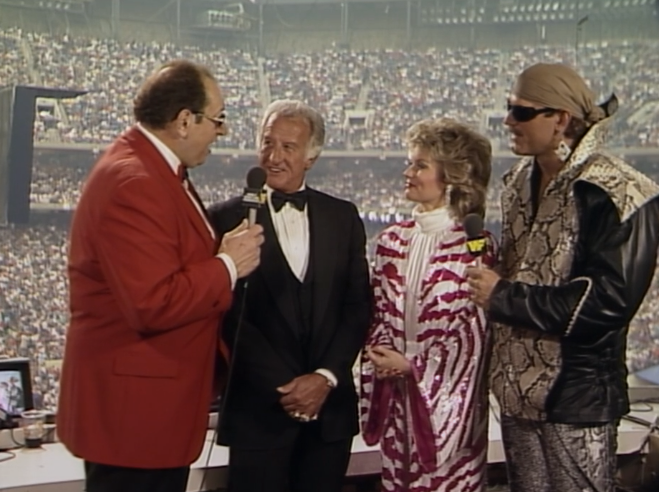We’re in Pontiac, Michigan at the Silverdome. This is it. This is the big one. I’ve watched a bunch of shows to check out the build for this because I was so excited for one of the all-time most important wrestling shows; WrestleMania III. While the original WrestleMania served as a demonstration of the pomp and pageantry (and celebrity) that Vince wanted to surround WrestleMania, it wasn’t until WrestleMania III that the company put together a legitimate supershow. With big matches and a huge match on the top. A star-studded line up, completed by the companies biggest match going on last. Compare this to 1986 and WrestleMania II when the main was Hogan-Bundy in a cage and their biggest match of the year was Hogan-Orndorff, and you see how they’ve switched the mentality. WrestleMania is the big one and it’s about to get treated that way. Hosts are Gorilla Monsoon and Jesse Ventura. It’s easy to forget that Monsoon remained the WWF’s main PBP guy right up to 1993, when they tried to replace him (unsuccessfully) with Jim Ross. Ventura would remain the main colour guy until the middle of 1990.