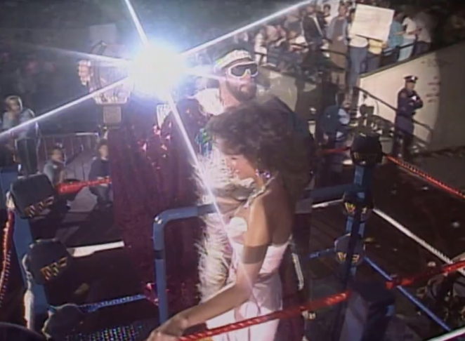 There’s a great build for this, which is partially why the crowd are so into it from the start. Savage put Steamboat on the shelf at the end of last year by crushing his larynx with the ring bell. Steamboat returned to help George Steele in his attempts to best Savage. Steele himself is obsessed with liberating Miss Elizabeth. “History beckons the Macho Man, yeah!”