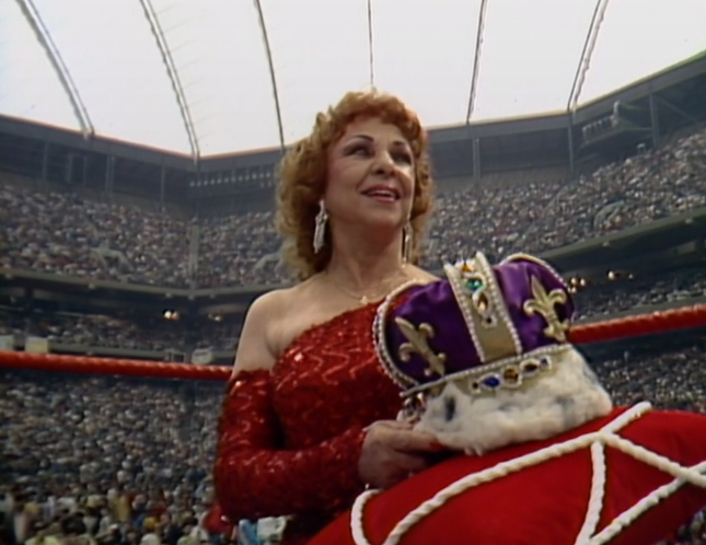 The loser of this match must bow and kneel before the winner. Bobby Heenan claimed Samantha Fox would be holding the crown here but it’s Fabulous Moolah. Bit of a downgrade.