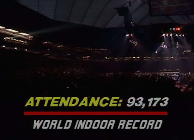 Gene Okerlund hops in the ring to announce the attendance. 93,173 is figure that we’re going with. The crowd is enormous. I can believe there was 90k in there. Dave Meltzer reported 78,000 but I’ve been in the the AEW All In London crowd, which was around that, and this legitimately looks bigger. I guess we’ll never know, as wrestling promoters simply cannot be trusted to tell the truth.