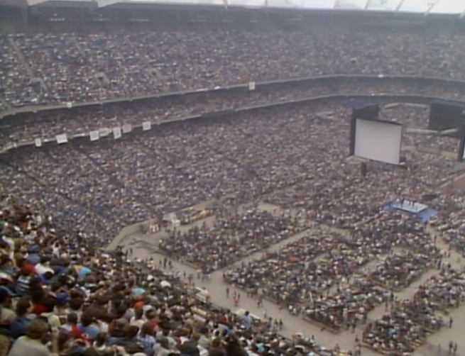 This is the first time the WWF used the crowd as a backdrop. I’ve seen shows with enormous crowds that pre-date this, and this is the first time they incorporated that mass of humanity as a part of the shot. It is one hell of a backdrop. I love that there’s no structure around the ring at all. They’ve made sure views are unobstructed.