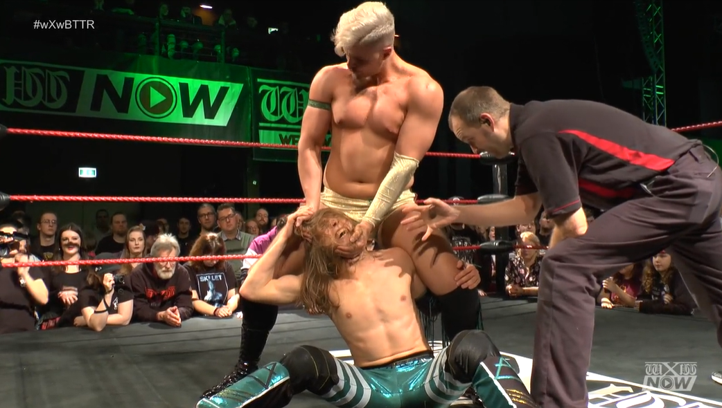 If he can stay healthy he’d be a great asset for wXw. His rope work here is on point and he’s fun to watch. Santos is an interesting character. He’s committed to the Goldenboy gimmick with bleached blonde hair and golden ring gear. I’m not sure about the moustache. It makes him look like a bigger Tyler Bate and you don’t want people making that comparison. Rotation wins here with the 450 splash and this was perfectly fine. Hopefully Rotation can do something in 2020.